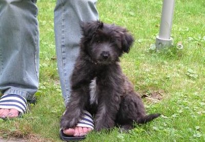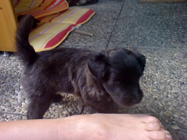 Chayton und seine Geschwister können nun seit wenigen Tagen sehen, und es ist der früheste Zeitpunkt, um Fremde kennenzulernen. Offenbar hielt uns mama Harissa nicht für sonderlich gefährlich: sie beobachtete kurz, was wir da mit ihren Welpen anstellten, und dann war sie zufrieden. Hundebabies in dem Alter sind von ihrem Alltag eigentlich schon genug gefordert, und dann kommen da zwei völlig Ungekannte und wollen betatschen,kraulen, streicheln - immerhin ist's im Schoss mollig warm und so lohnt die Flucht in tiefen, friedlichen Schlaf.12. August 2007: zu Besuch im Schänggeli